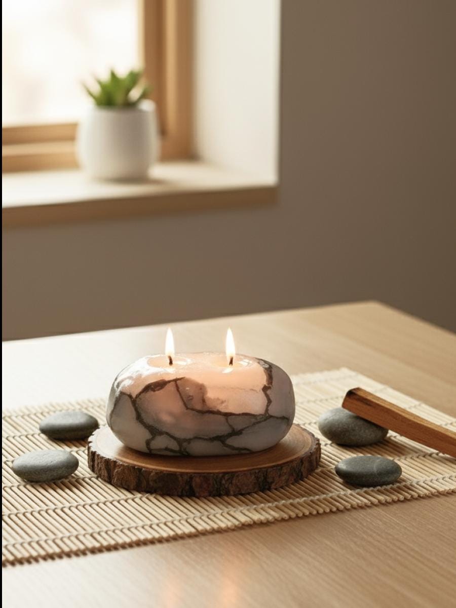 Personalized Stone Candle — a unique, handmade double-wick candle that brings natural elegance to any space. Crafted from a blend of unscented palm wax and food-grade paraffin, this candle offers a clean, long-lasting burn without any scent, making it ideal for those who prefer an unscented ambiance.