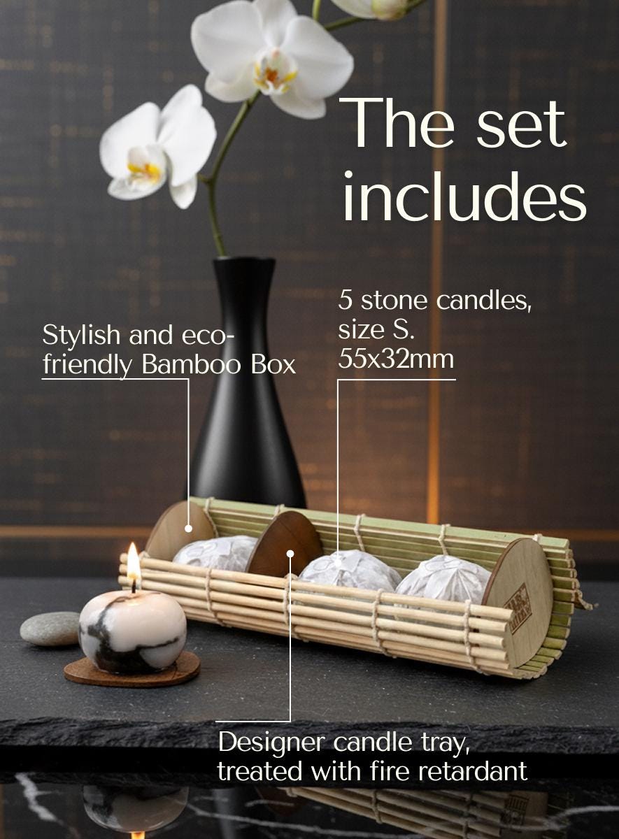 Immerse yourself in calm and harmony with SHAKHOV’s minimalist “Burning Stones” set — 3 handcrafted candles in a natural bamboo box.