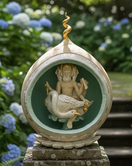 For me, this Brahma, enclosed in an egg-shaped capsule, tells the story of Brahmanda, the Cosmic Egg. It is the point of transition where the unmanifest begins to find its being. Every detail—from the turquoise glaze representing the Causal Ocean to the golden spiral of the spire—is my way of showing the upward movement of pure energy."
