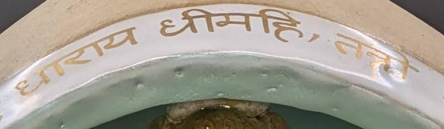 Brahma Gayatri Mantra: I have hand-applied the sacred mantra in liquid gold, fusing the words directly into the glaze: "oṃ vedātmaneca vidmahe | hiraṇyagarbhāya dhīmahi | tanno brahmā pracodayat"