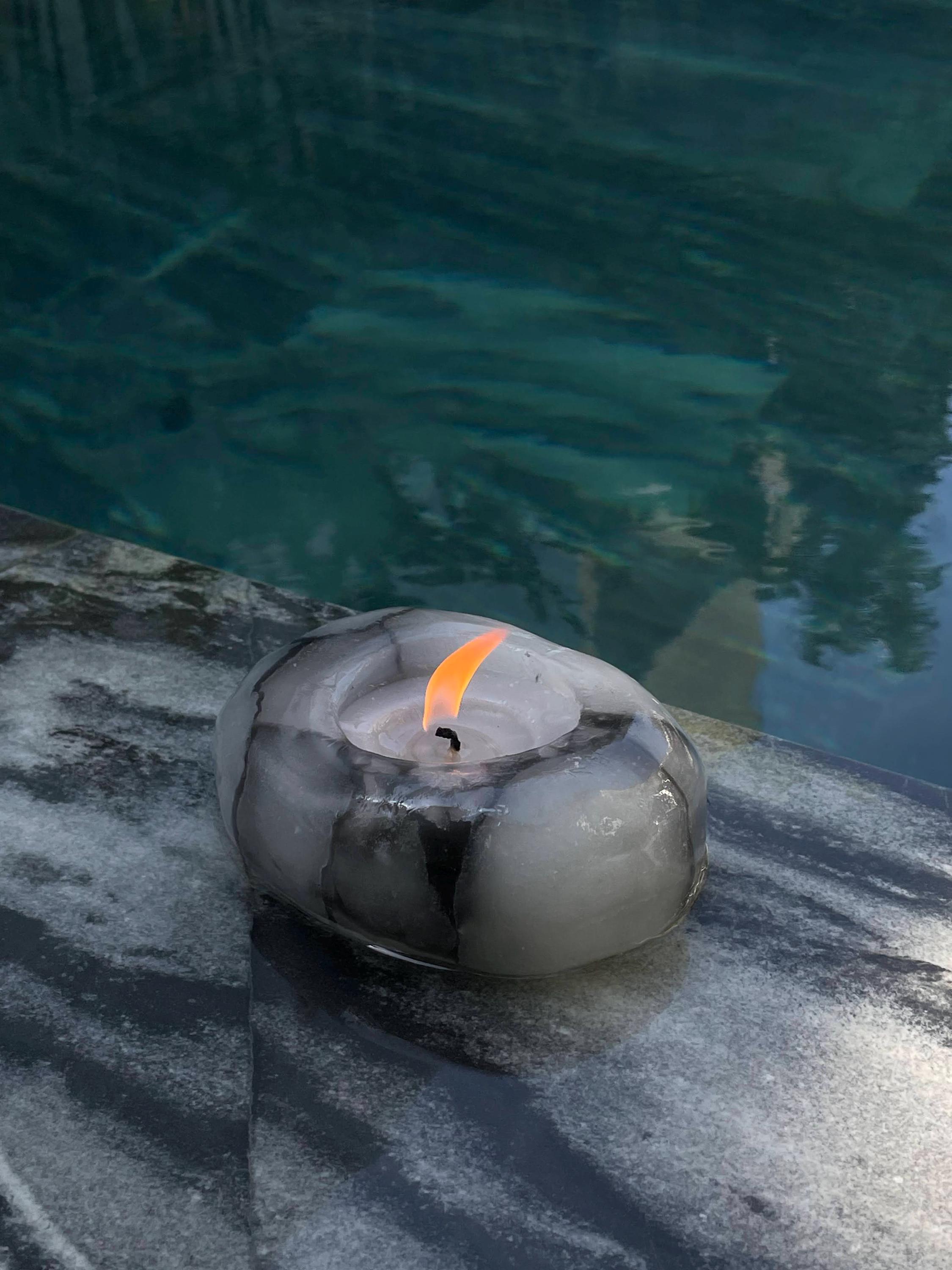Dripping happens when the rate of wax melting exceeds the rate of wax consumption by the flame. The excess liquid wax overflows the melt pool and runs down the sides. Common causes include oversized wicks (too much heat, too much melting), drafts (uneven heat distribution pushes liquid wax to one side), and tilted candles (gravity pulls the melt pool to the low side). Stone candles are sealed with three layers of protective lacquer that prevent wax from seeping through the surface. However, if the lacquer is scratched or damaged, wax can leak through at that point. This is why we always recommend using a candle holder or tray underneath — SHAKHOV sells dedicated candle trays designed for this purpose. No candle, regardless of construction, should be guaranteed never to drip.